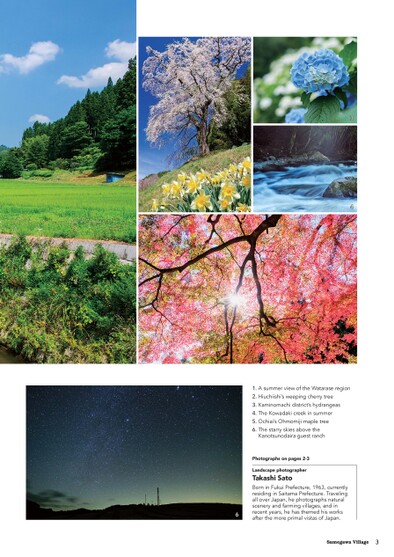 345211.AsummerviewoftheWataraseregion2.Hiuchiishi’sweepingcherrytree3.Kaminomachidistrict’shydrangeas4.TheKowadakicreekinsummer5.Ochiai’sOhmomijimapletree6.ThestarryskiesabovetheKanotsunodairaguestranchPhotographsonpages2-3LandscapephotographerTakashiSatoBorninFukuiPrefecture,1963,currentlyresidinginSaitamaPrefecture.TravelingalloverJapan,hephotographsnaturalsceneryandfarmingvillages,andinrecentyears,hehasthemedhisworksafterthemoreprimalvistasofJapan.63