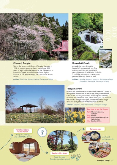 Cho-onjiTempleWithinthegroundsofCho-onjiTemple,foundedin1532,isagreatweepingcherrytreeofover200yearsofage,saidtobeplantedintheEdoperiodinmemoryofthosewhodiedintheGreatTenmeiFamine.Infall,youcanenjoythecrimsonfallleavesaswell.AddressDoshoda,AkasakaNakano,SamegawaVillageKowadakiCreekAcreekthatrunsalongsideRoute349forroughly2km.Thewalkingpathletsyouenjoybothnewgreeneryandfallleaves.Potholesformedbypebblesandcurrentsarepresenthereandthere,aswell.Address-Maeda,AkasakaHigashino,SamegawaVillage.-Kowadaki,Nishiyama,SamegawaVillage.TateyamaParkBuiltontheformersiteofAkasakadate(AkasakaCastle),adesignatedhistoricsiteofthevillage,thisparkhasbeenhand-madebyvillageresidents.Inspringandsummer,seasonalflowersbloomhere,whileinfall,youcanobservethecolorfulfoliageinthepark,orseetheentirevillagedyedredandyellowfromthemountainsummit!AddressTateyama,AkasakaNakano,SamegawaVillageKanotsunodairaGuestRanchSleepinacottage,andeatBBQfordinner!Day2ExploreMt.AsahiSavortheviewfromthemountainsummitApril:Cherryblossoms,daffodilsMay:AzaleasJune:Orange-yellowdaylilies,hydrangeasJuly:GoldbandliliesTemame-kanLunch,andbuyingsouvenirs5