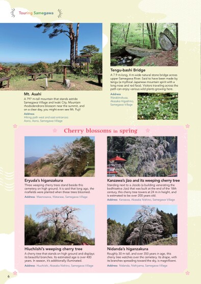 TouringSamegawaTengu-bashiBridgeA7.9m-long,4m-widenaturalstonebridgeacrossupperSamegawaRiver.Saidtohavebeenmadebytengu(amythicalJapanesemountainspiritwithalongnoseandredface).Visitorstravelingacrossthepathcanenjoyvariouswildplantsgrowinghere.AddressWarabinokusa,AkasakaHigashino,SamegawaVillageMt.AsahiA797m-tallmountainthatstandsastrideSamegawaVillageandIwakiCity.Mountainrhododendronsblossomnearthesummit,andonaclearday,youmightevenseeMt.Fuji!AddressHikingpathwestandeastentrances:Aono,Aono,SamegawaVillageCherryblossomsinspringEryuda’shiganzakuraThreeweepingcherrytreesstandbesidethiscemeteryonhighground.Itissaidthatlongago,thericefieldswereplantedwhenthesetreesbloomed.AddressMaenosawa,Watarase,SamegawaVillageKanzawa’sjizoanditsweepingcherrytreeStandingnexttoaJizodo(abuildingveneratingthebodhisattvaJizo)thatwasbuiltattheendofthe18thcentury,thischerrytreetowersat24minheight,andisestimatedtobeover200yearsold.AddressKanzawa,AkasakaNishino,SamegawaVillageHiuchiishi’sweepingcherrytreeAcherrytreethatstandsonhighgroundanddisplaysitsbeautifulbranches.Itsestimatedageisover400years.Inseason,it’sadditionallyilluminated.AddressHiuchiishi,AkasakaNishino,SamegawaVillageNidanda’shiganzakuraRoughly30mtall,andover350yearsinage,thischerrytreewatchesoverthecemetery.Itsshape,withitsbranchesspreadingtowardthesky,ismagnificent.AddressNidanda,Nishiyama,SamegawaVillage6