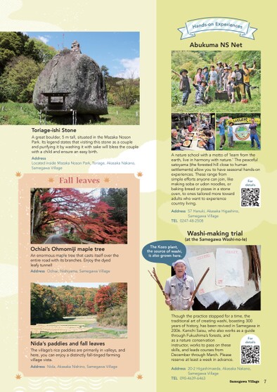naHds-onExperiencesAbukumaNSNetToriage-ishiStoneAgreatboulder,5mtall,situatedintheMazakaNosonPark.Itslegendstatesthatvisitingthisstoneasacoupleandpurifyingitbywashingitwithsakewillblessthecouplewithachildandensureaneasybirth.AddressLocatedinsideMazakaNosonPark,Toriage,AkasakaNakano,SamegawaVillageFallleavesAnatureschoolwithamottoof‘learnfromtheearth,liveinharmonywithnature.’Thepeacefulsatoyama(theforestedhillclosetohumansettlements)allowyoutohaveseasonalhands-onexperiences.Theserangefromsimpleeffortsanyonecanjoin,likemakingsobaorudonnoodles,orbakingbreadorpizzasinastoneoven,toonestailoredmoretowardadultswhowanttoexperiencecountryliving.Address57Hanuki,AkasakaHigashino,SamegawaVillageTEL0247-48-2508detailsForOchiai’sOhmomijimapletreeAnenormousmapletreethatcastsitselfovertheentireroadwithitsbranches.Enjoythedyedleafytunnel!AddressOchiai,Nishiyama,SamegawaVillageTheKozoplant,thesourceofwashi,isalsogrownhere.Washi-makingtrial(attheSamegawaWashi-no-Ie)Nida’spaddiesandfallleavesThevillage’sricepaddiesareprimarilyinvalleys,andhere,youcanenjoyadistinctlyfall-tingedfarmingvillagevista.AddressNida,AkasakaNishino,SamegawaVillageThoughthepracticestoppedforatime,thetraditionalartofcreatingwashi,boasting300yearsofhistory,hasbeenrevivedinSamegawain2006.KanichiSaisu,whoalsoworksasaguidethroughFukushima’sforests,andasanatureconservationinstructor,workstopassontheseskills,andleadscoursesfromDecemberthroughMarch.Pleasereserveatleastaweekinadvance.detailsForAddress20-2Higashimaeda,AkasakaNakano,SamegawaVillageTEL090-4639-64637