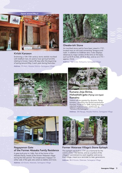 OpensaroundMay2KiriishiKanzeonEnshrininga13th-15thcenturystoneobeliskinscribedwithSiddhamtext,it’ssaidtohavespiritualbenefitsrelatingtohorses.Opens88daysafterthebeginningofspring(aroundMay2eachyear)duringfestivities.Address93Kami,AkasakaNishino,SamegawaVillageOiwake-ishiStoneAninscribedstonesaidtohavebeenraisedin1721,locatednearanoldroadconnectingTanaguraandIwaki.InadditiontoSiddhamtext,italsodisplaysdistancestomajorcentersofthetimeontheback,suchas50RitoEdo,24RitoAizu,andsoon(1Ri=approx.4km).Address156Orido,Nishiyama,SamegawaVillageKumanoJinjaShrine,Hishoshishi-gata(FlyingLion-type)KomainuVisitorswillbegreetedbydynamic,flyingkomainu,carvedbythefamedstoneworkerKomatsuTorakichiin1898,hailingfromtheadjacentAsakawaarea,andknownas‘Tohoku’sMichelangelo.’Address385Myoga,AkasakaNishino,SamegawaVillageNagayamonGateoftheFormerAkasakaFamilyResidenceAgatebuiltpriorto1686.PartofthehomeoftheAkasakafamily,headsoftheformerWatarasevillageduringtheEdoperiod.Thelonghouses(‘nagaya’)oneithersideofthegatealsoactedasstablesandmore.Address60Kinone,Watarase,SamegawaVillageFormerWataraseVillage’sStoneEpitaphThisepitaphwasbuiltin1791asamemorialforthevictimsofthe1783famine,andasasymbolofthevillagers’commitmenttoworktogetherandrevivetheirvillage,meantasaremindertolatergenerations.Address88-2Kinone,Watarase,SamegawaVillage9
