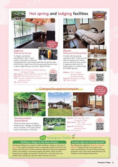 HotspringandlodgingfacilitiesGermanlog-basedboilerSagiri-so(Daytriphotspring)Avillagercarefacilityrefurbishedin2011.LocallumberisburnedinaGermanlog-basedboiler,whichheatsboththehotspringwaterandthefloor.Apartfromthehotspringandsauna,thereisalsoalargehallyoucanrestin,openforfree.Address199-2Hirohata,AkasakaHigashino,SamegawaVillageOpenhours10:00–20:00(finalentryat19:30)DaysoffWednesdays,Dec.31–Jan.4FeesEntryfeerequiredforelementaryschoolstudentsorolderTEL0247-49-2205FordetailsMusubi(EateryandHotSpringHotel)Ahotelwithhotspringsopenedin2021.Therearetwotypesofguestroomswhereyoucanrestfromyourtravels,aJapanese-styleroomforlargegroups,orwestern-styleforsmallergroups.Address194-1Hirohata,AkasakaHigashino,SamegawaVillageDaysoffMondays&TuesdaysTEL0247-57-8677FordetailsCottages/bungalows/campsiteYoucanbarbecueonthecottageterrace.KanotsunodairaGuestRanchTherearethreetypesoflodgingfacilitieshere,cottages,bungalows,andacampsite.Inallcases,pleasemakeareservationinadvance.Address343Yoyomugi,Aono,SamegawaVillageOpenhours9:00–17:00(until16:00inwinter)DaysoffWednesdays,start/endofyearTEL0247-48-2010FordetailsSamegawaTriviaBuildingavillageonthebackofbeansSamegawaVillagehasaprogramcalled‘buildingavillageonthebackofbeans’(theoriginalexpressionreliesonJapaneseusingthesametermforbeansandhardwork),aimedtopromoteagricultureandencouragegoodhealthintheelderly.Itpromotesgrowingsoybeans,whicharethenboughtbythevillage,processedinTemame-kan,andsold.Findasoyproductthatcatchesyoureyeandmakeasouveniroutofit!Anamerightoutofthebigcity?!Thevillagehall’saddressis‘Shinjuku,AkasakaNakano.’Despitebeinginthecountry,thename,soundinglikeastringofTokyolocations,entertainsmany.Someeventakephotosbythe‘Shinjukutunnel’besideTemame-kan.11