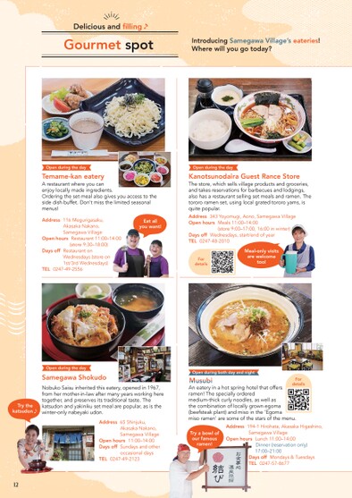 Deliciousand♪GourmetspotIntroducingSamegawaVillage’sWherewillyougotoday?eateries!OpenduringthedayTemame-kaneateryArestaurantwhereyoucanenjoylocallymadeingredients.Orderingthesetmealalsogivesyouaccesstothesidedishbuffet.Don’tmissthelimitedseasonalmenus!Eatallyouwant!Address116Megurigasaku,AkasakaNakano,SamegawaVillageOpenhoursRestaurant11:00–14:00(store9:30–18:00)DaysoffRestaurantonWednesdays(storeon1st/3rdWednesdays)TEL0247-49-2556OpenduringthedaySamegawaShokudoNobukoSaisuinheritedthiseatery,openedin1967,fromhermother-in-lawaftermanyyearsworkingheretogether,andpreservesitstraditionaltaste.Thekatsudonandyakinikusetmealarepopular,asisthewinter-onlynabeyakiudon.Trythekatsudon♪Address65Shinjuku,AkasakaNakano,SamegawaVillageOpenhours11:00–14:00DaysoffSundaysandotheroccasionaldaysTEL0247-49-212312OpenduringthedayKanotsunodairaGuestRanceStoreThestore,whichsellsvillageproductsandgroceries,andtakesreservationsforbarbecuesandlodgings,alsohasarestaurantsellingsetmealsandramen.Thetorororamenset,usinglocalgratedtororoyams,isquitepopular.Address343Yoyomugi,Aono,SamegawaVillageOpenhoursMeals11:00–14:00winter)(store9:00–17:00,16:00inDaysoffWednesdays,start/endofyearTEL0247-48-2010FordetailsMeal-onlyvisitsarewelcometoo!OpenduringbothdayandnightMusubiFordetailsAneateryinahotspringhotelthatoffersramen!Thespeciallyorderedmedium-thickcurlynoodles,aswellasthecombinationoflocallygrownegoma(beefsteakplant)andmisointhe‘Egomamisoramen’aresomeofthestarsofthemenu.Tryabowlofourfamousramen!Address194-1Hirohata,AkasakaHigashino,SamegawaVillageOpenhoursLunch11:00–14:00Dinner(reservationonly)17:00–21:00DaysoffMondays&TuesdaysTEL0247-57-8677