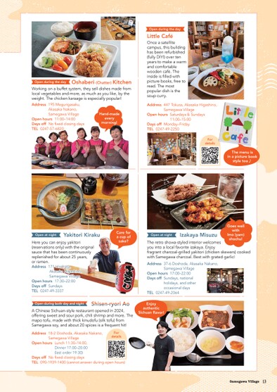 OpenduringthedayOshaberi(Chatter)KitchenWorkingonabuffetsystem,theyselldishesmadefromlocalvegetablesandmore,asmuchasyoulike,bytheweight.Thechickenkaraageisespeciallypopular!Address195Megurigasaku,AkasakaNakano,SamegawaVillageOpenhours11:00–14:00DaysoffNofixedclosingdaysTEL0247-57-6820Hand-mademorning!everyCareforacupofsake?OpenatnightYakitoriKirakuHereyoucanenjoyyakitori(reservationsonly)withtheoriginalosaucethathasbeencontinuouslyreplenishedforabout25years,orramen.Address171Hirohata,AkasakaHigashino,SamegawaVillageOpenhours17:30–22:00DaysoffSundaysTEL0247-49-3337OpenduringbothdayandnightShisen-ryoriAoAChineseSichuan-stylerestaurantopenedin2024,offeringsweetandsourpork,chilishrimpandmore.Themapotofu,madewiththickkinudofu(silktofu)fromt!Samegawasoy,andabout20spicesisafrequenthiForAddress18-2Doshoda,AkasakaNakano,SamegawaVillageOpenhoursLunch11:30–14:00,Dinner17:00–20:00(lastorder19:30)DaysoffNofixedclosingdaysTEL090-1939-1400(cannotanswerduringopenhours)detailsOpenduringthedayLittleCaféOnceasatellitecampus,thisbuildinghasbeenrefurbished(fullyDIY!)overtenyearstomakeawarmandcomfortablewoodencafé.Theinsideisfilledwithpicturebooks,freetoread.Themostpopulardishisthesoupcurry.Address447Tokusa,AkasakaHigashino,SamegawaVillageOpenhoursSaturdays&Sundays11:00–15:00DaysoffMonday–FridayTEL0247-49-2250FordetailsinapicturebookThemenuisstyletoo♪GoeswellwithImo(yam)shochu!OpenatnightIzakayaMisuzuTheretroshowa-styledinteriorwelcomesyouintoalocalfavoriteizakaya.Enjoyfragrantcharcoal-grilledyakitori(chickenskewers)cookedwithSamegawacharcoal.Bestwithgratedgarlic!Address37-6Doshoda,AkasakaNakano,SamegawaVillageOpenhours17:00–22:00DaysoffSundays,nationalholidays,andotheroccasionaldaysTEL0247-49-2064EnjoyauthenticSichuanflavor!13