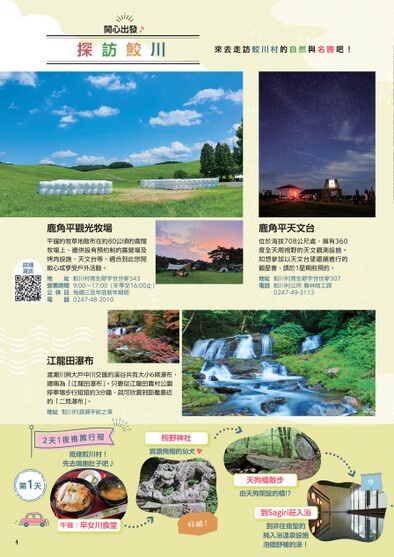 開心出發♪探訪鮫川來去走訪鮫川村的自然與名勝吧!鹿角平觀光牧場平緩的牧草地散布在約80公頃的廣闊牧場上,還併設有預約制的露營場及烤肉設施、天文台等。適合到此悠閒散心或享受戶外活動。地址鮫川村青生野字世世麥343營業時間9:00~17:00(冬季至16:00止)公休電話0247-48-2010日每週三及年底新年期間詳細資訊鹿角平天文台位於海拔708公尺處,擁有360度全天周視野的天文觀測設施。如想參加以天文台望遠鏡進行的觀星會,請於1星期前預約。地址鮫川村青生野字世世麥307電話鮫川村公所農林商工課0247-49-3113江龍田瀑布渡瀨川與大戶中川交匯的溪谷共有大小6條瀑布,總稱為「江龍田瀑布」。只要從江龍田農村公園停車場步行短短約3分鐘,就可欣賞到距離最近的「二見瀑布」。地址鮫川村渡瀨字前之澤2天1夜推薦行程抵達鮫川村!先去填飽肚子吧♪熊野神社賞讚飛翔的狛犬♥午餐:早女川食堂第1天4天狗橋散步由天狗架設的橋!?到Sagiri莊入浴到非住宿型的純入浴溫泉設施泡個舒暢的澡!