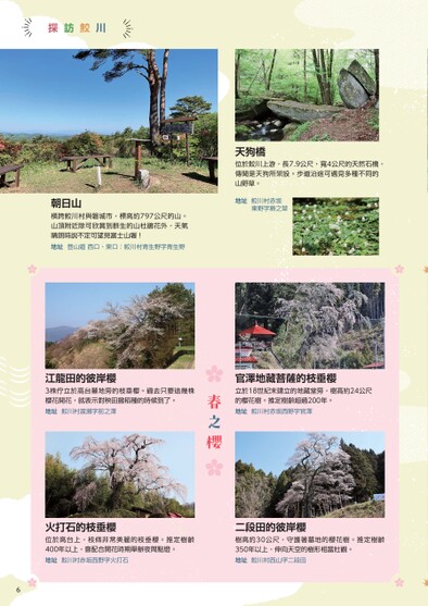 探訪鮫川天狗橋位於鮫川上游,長7.9公尺、寬4公尺的天然石橋,傳聞是天狗所架設。步道沿途可遇見多種不同的山野草。地址鮫川村赤坂東野字蕨之草朝日山橫跨鮫川村與磐城市,標高約797公尺的山。山頂附近除可欣賞到群生的山杜鵑花外,天氣晴朗時說不定可望見富士山喔!地址登山道西口、東口:鮫川村青生野字青生野官澤地藏菩薩的枝垂櫻立於18世紀末建立的地藏堂旁,樹高約24公尺的櫻花樹。推定樹齡超過200年。地址鮫川村赤坂西野字官澤春之櫻江龍田的彼岸櫻3株佇立於高台墓地旁的枝垂櫻。過去只要這幾株櫻花開花,就表示對秧田撒稻種的時候到了。地址鮫川村渡瀨字前之澤火打石的枝垂櫻二段田的彼岸櫻位於高台上,枝條非常美麗的枝垂櫻。推定樹齡400年以上,會配合開花時期舉辦夜間點燈。地址鮫川村赤坂西野字火打石樹高約30公尺,守護著墓地的櫻花樹。推定樹齡350年以上,伸向天空的樹形相當壯觀。地址鮫川村西山字二段田6
