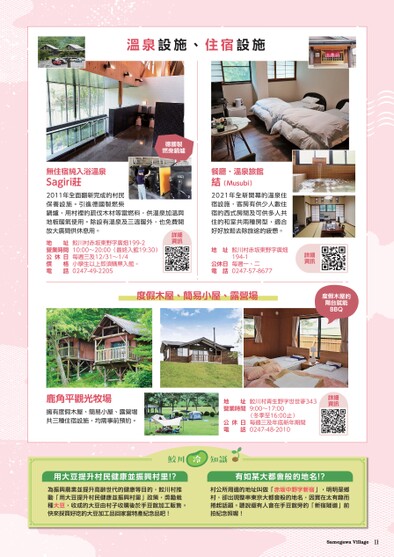 溫泉設施、住宿設施德國製燃柴鍋爐無住宿純入浴溫泉Sagiri莊2011年全面翻新完成的村民保養設施。引進德國製燃柴鍋爐,用村裡的疏伐木材等當燃料,供溫泉加溫與地板暖氣使用。除設有溫泉及三溫暖外,也免費開放大廣間供休息用。地址鮫川村赤坂東野字廣畑199-2營業時間10:00~20:00(最終入館19:30)公價格小學生以上即須購票入館。電話0247-49-2205休日每週三及12/31~1/4詳細資訊餐廳・溫泉旅館結(Musubi)2021年全新開幕的溫泉住宿設施,客房有供少人數住宿的西式房間及可供多人共住的和室共兩種房型,適合好好放鬆去除旅途的疲憊。地址鮫川村赤坂東野字廣畑194-1公休日每週一、二電話0247-57-8677詳細資訊度假木屋、簡易小屋、露營場度假木屋的陽台就能BBQ鹿角平觀光牧場擁有度假木屋、簡易小屋、露營場共三種住宿設施,均需事前預約。地址鮫川村青生野字世世麥343營業時間9:00~17:00(冬季至16:00止)公電話0247-48-2010休日每週三及年底新年期間詳細資訊川冷知識用大豆提升村民健康並振興村里!?有如某大都會般的地名!?為振興農業並提升高齡世代的健康等目的,鮫川村推動「用大豆提升村民健康並振興村里」政策,獎勵栽種大豆,收成的大豆由村子收購後於手豆館加工販售。快來採買好吃的大豆加工品回家當特產紀念品吧!村公所周邊的地址叫做「赤坂中野字新宿」,明明是鄉村,卻出現整串東京大都會般的地名,因實在太有趣而捲起話題。聽說還有人會在手豆館旁的「新宿隧道」前拍紀念照喔!11