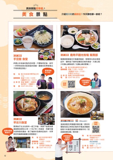 美味餐點好幸福♪美食景點介紹鮫川村的餐飲店!今天要吃哪一家呢?白天營業手豆館食堂供應以本地食材製作的料理。只要點用定食,就可一併享用自助式配菜區的菜餚。還會依各季節推出不同的限定菜色!盡情填飽肚子吧!地址鮫川村赤坂中野字巡之作116營業時間食堂11:00~14:00(直販所9:30~18:00)公日食堂每週三(直販所每月第1、3個週三)電話0247-49-2556休白天營業早女川食堂招牌料理是豬排丼♪齋須信子太太在長年一起工作後,承接下這家由婆婆創業自昭和42年(1967年)的食堂,持續守護大家熟悉的風味。除了豬排丼及燒肉定食外,冬季限定的鍋燒烏龍麵也很受歡迎!地址鮫川村赤坂中野字新宿65營業時間11:00~14:00公另可能不定期公休電話0247-49-2123休日每週日,12白天營業鹿角平觀光牧場販賣部販賣部除販售村中物產與雜貨、受理BBQ及住宿登記外,還併設了提供拉麵及定食的食堂。大推以鮫川村產山藥製成的「拉麵山藥泥套餐」!地址鮫川村青生野字世世麥343營業時間用餐11:00~14:00(販賣部9:00~17:00,冬季至16:00止)公電話0247-48-2010休日每週三及年底新年期間詳細資訊也熱烈歡迎只用餐的客人!白天、晚上營業結(Musubi)溫泉旅館在其餐廳供應拉麵!提供的餐點包括以特別訂製的中粗波浪麵搭配鮫川村產荏胡麻與味噌製作的「荏胡麻味噌拉麵」等料理。詳細資訊來嚐嚐我們自豪的拉麵吧!地址鮫川村赤坂東野字廣畑194-1營業時間午餐11:00~14:00預約制晚餐17:00~21:00公電話0247-57-8677休日每週一、二