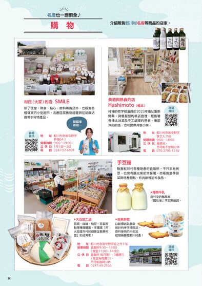 名產也一應俱全♪購物介紹販售鮫川村名產等商品的店家。村民(大家)的店SMILE除了便當、熟食、點心、飲料等食品外,也販售各種雜貨的小型超市。名產區展售烏龍麵與荏胡麻沾醬等本村特產品。歡迎來逛逛~美酒與熟食的店Hashimoto(橋本)村裡的老字號酒商於2023年遷址重新開幕。貨櫃屋型的新店面裡,販售著各種本地酒及手工調理的熟食。事前預約的話,也可提供冷盤小菜。詳細資訊詳細資訊地址鮫川村赤坂中野字新宿64-1營業時間9:00~19:00公日1月1日~3日電話0247-57-6901休地址鮫川村赤坂中野字宿之入158營業時間9:00~18:00公另可能不定期公休電話070-2795-1316休日每週日,手豆館販售鮫川村各種物產的直販所。不只本地民眾,也常有觀光客前來採購。亦販售當季蔬菜與特產甜點、炸肉餅等油炸食品。▶澤西牛乳由村中的酪農家「翼牧場」不定期進貨。▶大豆加工品豆腐、味噌、納豆、豆製甜點等種類豐富。來嚐嚐「用大豆提升村民健康並振興村里」的成果吧!▶鯊魚餅乾以鮫傳說為意象設計的伴手禮商品。原料使用的米粉及荏胡麻都是鮫川村產!地址鮫川村赤坂中野字巡之作116營業時間直販所9:30~18:00(食堂11:00~14:00)公休(食堂為每週三),另可能臨時公休電話0247-49-2556日直販所每月第1、3個週三詳細資訊14