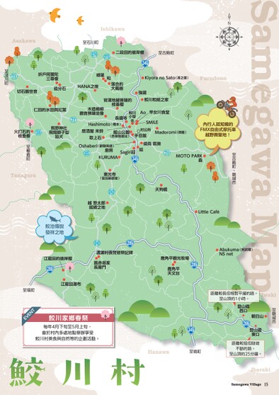 至古殿町、磐城市內行人就知曉的FMX自由式摩托車越野賽聖地!15至磐城市朝日山登山道西口289登山道東口距離較長但相對平緩的路。至山頂約1小時。距離較短但陡坡不斷的路。至山頂約25分鐘。349至塙町天狗橋LittleCaféAbukuma(阿武隈)NSnet鹿角平觀光牧場鹿角平天文台289東光寺(富田藥師堂)242越惣太郎就縛之地242289渡瀨村救荒修祭記碑舊赤坂家長屋門鮫池傳說發祥之地江龍田的彼岸櫻289江龍田瀑布至塙町EVENT鮫川家鄉春祭每年4月下旬至5月上旬,會於村內多處地點舉辦享受鮫川村美食與自然等的企劃活動。KiyoranoSato(清之里)強瀧鮫川和紙之家Ao早女川食堂SMILE木造楊柳觀音菩薩坐像官澤地藏菩薩的枝垂櫻鮫川小學長遠寺Hashimoto(橋本)居酒屋未鈴取上石館山公園(赤坂館遺址)村公所手豆館Madoromi(微睡)Oshaberi(歡聲笑語)廚房25KURUMA燒鳥氣樂71結Sagiri莊349MOTOPARK森仁田的水田與紅葉71熊野神社飛翔獅子型狛犬火打石的枝垂櫻25至棚倉町至石川町274275二段田的彼岸櫻至古殿町349折戶阿彌陀三尊像鄉里和追分石HANA之宿落合的大楓樹切石觀世音71至淺川町