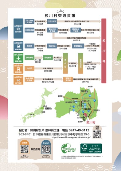 鮫川村鮫川村交通資訊川口系統交流道東北自動車道白河交流道國道289號▶棚倉町▶縣道25號約2小時約55分鐘三鄉交流道常磐自動車道約1小時50分鐘磐城勿來交流道常磐自動車道約10分鐘磐城湯本交流道縣道14號▶古殿町▶國道349號約50分鐘國道289號▶國道349號約45分鐘東京站JR東北新幹線新白河站路線巴士(白棚線)磐城棚倉站約1小時20分鐘約45分鐘村營巴士Aozora(青空)號(1天2~3班)約30分鐘路線巴士(經寶木的鮫川線)(1天2~4班)約35分鐘磐城石川站郡山站JR水郡線約50分鐘須賀川交流道國道118號▶淺川町▶縣道71號伊丹機場福島機場約1小時10分鐘利木津巴士約40分鐘仙台站仙台宮城交流道JR東北新幹線約40分鐘東北自動車道約1小時30分鐘約1小時至仙台福島市福島站3496磐城市郡山市49磐越自動車道福島機場349郡山站JR東北新幹線東北自動車道常磐自動車道鮫川村JR水郡線118新白河站白河市至水戶至新潟磐越自動車道會津若松市豬苗代湖仙台福島縣東京大阪118289由東京前來自行駕車由東京前來搭乘鐵路由大阪前來搭乘飛機由仙台前來搭乘鐵路由仙台前來自行駕車日本語English數位指南観光ガイドブックTourismGuidebook本印刷品使用的紙張原料木材來自依FSC®標準認證的「良好管理森林」,並以「植物性油墨」印刷。詳細資訊https://www.vill.samegawa.fukushima.jp/發行者:鮫川村公所農林商工課電話0247-49-3113963-8401日本福島縣東白川郡鮫川村赤坂中野字新宿39-5